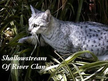 Shallowstream is an Eqyptian Mau. Her silver spotted pelt like the night sky. Her Eye are as gray as the moon on a gathering night. Her slim figure is perfect for hiding or hunting. Her fur always looks smooth and soft. She may be small but she is strong, And strong enough to protect. She has no scars, that she is aware of.