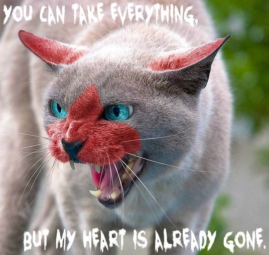 Jagger's group grew in size, and they successfully defeated the rouges who had destroyed her family. They celebrated their victory, but the night after the celebration, something happened to Jagger. An evil spirit, determined to take over the island for himself, possessed Jagger. She grew very cruel, and unfeeling for others. All she cared about was power, and she would kill anyone to get it. Eventually the spirit let Jagger retake control of her body, but it stayed in her, ready to take control when he needed to. Even though Jagger was in control of her body again, she was still more cruel, and she began to change the group. She named it the Tribe of Endless War, and they began to take prisoners. These prisoners were loners, kittypets, any cat they could get, and pit them against their strongest members in an arena. She set up more ranks, and they began to plot their take over of the island.