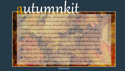 - [fancypost bgcolor=transparent; border: 0px solid transparent; width: 400px; height: 0px; font-family: gabriola; color: white; font-size: 80px; margin-bottom: 18px; margin-top: 10px;][color=orange]n[/color]ame[/fancypost][fancypost bgcolor=#3B8686; border: 2px solid burlywood; height: 220px; width: 400px; font-family: calibri; color: #000000; font-size: 11px; background: url(http://upload.wikimedia.org/wikipedia/en/thumb/3/37/Leaves.JPG/1280px-Leaves.JPG);][table][tr][td][fancypost bgcolor=white; border: 0px solid navy; width: 365px; height: 205px; opacity: 0.5; overflow: auto; color: black;] Text[/fancypost][/td][td][/td][/tr][/table]][/fancypost]
