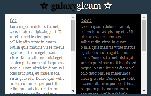 - Text[/fancypost][/td][td][fancypost bgcolor=black; border: 0px solid navy; width: 200px; height: 250px; border-radius: 0px 0px 0px 0px; margin-left: -4px; font-family: georgia; color: gray; overflow: auto;][u][i][size=14]ooc:[/size][/i][/u]