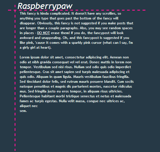 - [fancypost bgcolor=transparent; border: 0px solid transparent; width: 400px; height: 500px; color: white; font-family: trebuchet ms; border-left: 3px dashed deeppink; overflow: hidden; cursor: url("http://www.rw-designer.com/cursor-view/61968.gif"), auto;]