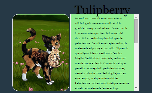 - [table][tr][td][fancypost bgcolor= dodgerblue; border: 1px solid white; width: 160px; height: 250px; border-radius: 20px; background: url(http://warriorcatsrpg.com/Themes/default/images/graphic.php?picture_height=280&picture_width=200&folder_name=adults&layer1=default&layer2=calico2&layer3=default&layer4=dark-olive-eyes&layer5=scar-flank&layer6=carried-kit-cream&layer7=undefined);][/fancypost][/td][td][fancypost bgcolor=lightgreen; border: 1px solid white; width: 200px; height: 250px; overflow: auto; font-family: calibri; font-size: 10px; color: black;]Text[/fancypost][/td][/tr][/table][/align]