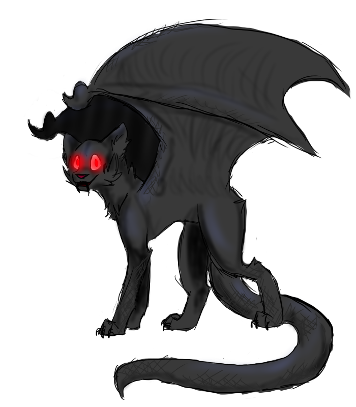Tsuhebi is a black she-cat with red eyes, viper fangs, a long scaly tail, large bat-like wings, and scales from her paws up to the area below her elbow. But make it natural, not like armor or anything. C: That's pretty much it.gender: