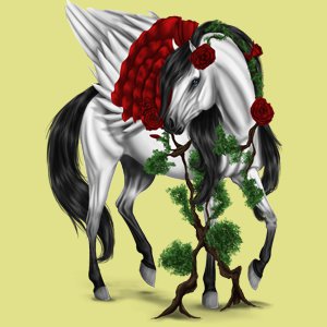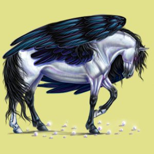 Nightfrost: White stallion with black neck & head. Green/blue eyes and goose feathers entwined in his mane & tail. Wings that are white and slowly fade to black.