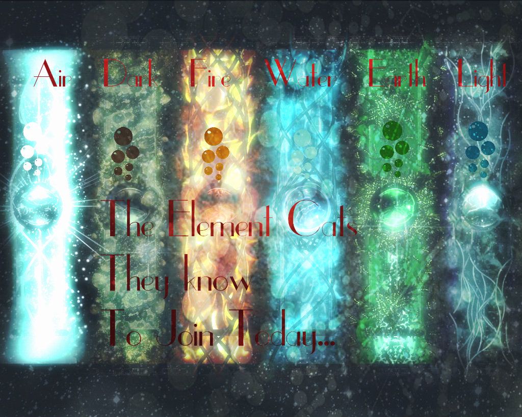 So my clan, The Elements Cats is a group of cats that has six clans. Fireclan, Darkclan, Lightclan, Waterclan, Airclan and Earthclan. Each clan can control their element. Im looking for a picture that has something to do with the Element Cats with text saying The Element Cats and listing the Elements or Join Today or something catchy! The contest ends June 23rd.