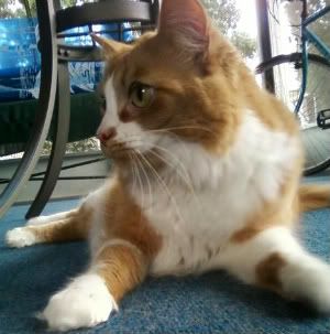 Foxclaw had NO white patches, but his fur is that shade of ginger, green eyes.