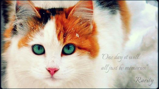 Rarity is a beautiful calico she-cat, with elegant fur as white as fallen snow covering the majority of her body. Large black and orange patches coat the upper half of her body, thinning out along her feathery tail. Her fur is thick, thinning out down her legs and smoothing over entirely over her small paws. Her best feature happens to be her wide eyes, a mixture of blue and green. Despite her small size, she has a lean body under her coat, making her incredibly agile. Each one of her features is touched with gentleness, making her appear much younger than she happens to be.