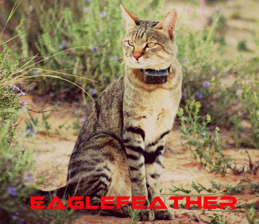 Pelt;; Eaglefeather's under pelt is a sandy brown. His over pelt is a plain old grey tabby coat. Sounds rather boring, no? Well let's get on to some other details, then. His front legs are ringed with black, giving them a tiger like appearance. The bridge of his nose is a rusty red, along with a few stripes leading from his eyes to the side of his head. The back of his ears are also the same rusty red. His fur is short and dense.