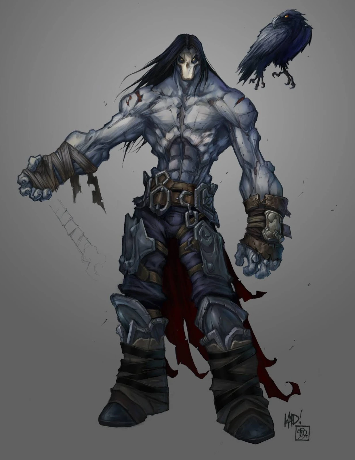 Personality: War has been described as the most honorable of the Four Horseman. He has demonstrated an unwillingness to kill foes who are not a threat to him, and has been shown to be disgusted by the very idea of killing an opponent when they are not at full strength. He also demonstrated this trait in his unwillingness to kill the Watcher when Samael urged him, still holding loyalty to the Council at the time. War is normally characterized by a very serious attitude. He tends to speak only when necessary, and even then tends to say only what absolutely needs to be said. He is also known to smile only rarely, and typically only either in battle or in anticipation of one. Beneath his stoic exterior, War is quick to anger and can be quite fearsome when provoked. Despite being quick to anger however, he has demonstrated a great deal of control over his temper, and is only rarely enraged to the point of actually losing control. He is known to relish combat, though he is known to dislike winning through dishonorable or underhanded means. He is also known to despise using stealthy means to achieve his ends, preferring open conflict to deception or subtlety and especially hating the idea of assassinating a foe. However, this straightforwardness should not be mistaken for a lack of intelligence, as Death himself has openly acknowledged that War's tactical acumen is even greater than his own. However, War can also be somewhat belligerent, and is known to sometimes lose himself to the thrill of battle. Perhaps the greatest example of this was the incident that cost him his natural left arm. Swept up in the heat of combat, he refused an order from Death to stand down during a battle with an unidentified group of opponents. He then engaged his fellow Horsemen and attempted to kill Fury in his rage. The blow was intercepted by Death, who admonished War and sliced his arm off as a lesson. Despite his loyalty, even the Council is said to have difficulty reigning in his lust for battle on occasion. Despite his honorable tendencies, he is phenomenally brutal in combat, and can be quite vindictive if he has been wronged by an opponent. For instance, before executing Abaddon, War took advantage of a critical injury he had dealt to his foe to tear Abaddon's wings off of his back, for no other reason than to spite him for all the trouble he had caused War. He also seems to share a close bond with Death, and has been shown to trust his elder brother almost implicitly despite their extremely differing personalities.