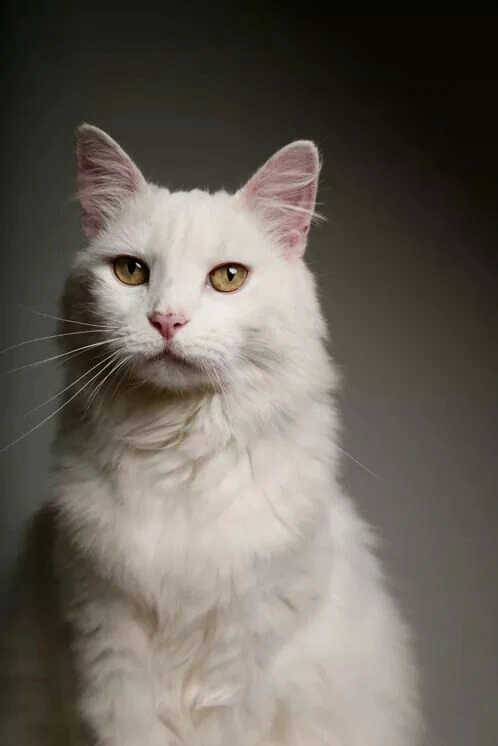 DESCRIPTION: A large white long-haired Maine Coon with bright golden optics. A necklace with a piece of beryl attached dangles from his neck.