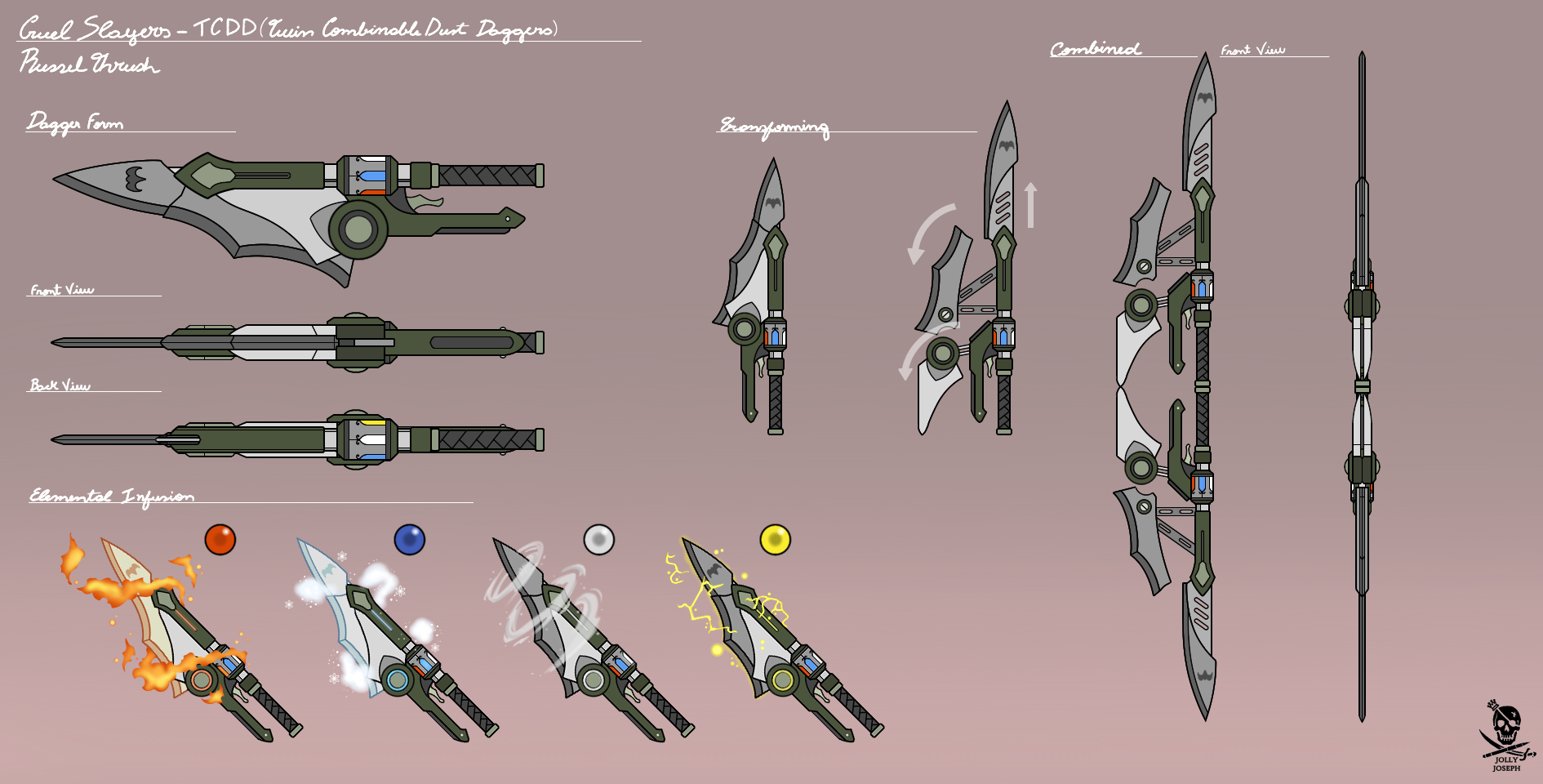 WEAPON; He uses a set of dual daggers that he keeps in a holster tied around his waist. The daggers are mostly used when he is swooping in or aiming at a fleeing target. When he is grounded he will combine them to create a double-bladed staff. Both daggers can infused with Dust, making them more effective in combat.relationship