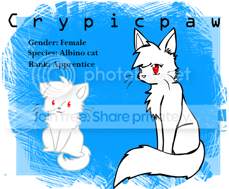 Her name then had been Snow, her mother Bella had called her that because of her pretty white pelt. Bella was a loner meaning she wasn't at that time living with twolegs or a clan. Then Crypticpaw or Snow's identity had been a small bundle of energy and joy, just a small happy kit. But her first identity was snatched away when her father who was a bad cat, not that her mother had known, stole her away to join his band of 'rouges'.