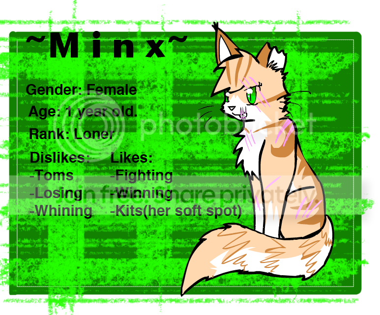 Minx is a rough she-cat with an attitude, she is someone you don't want to mess with. She is a very proud she-cat and she hates the very though of even losing to someone. She is strong and very stubborn, once something gets into her mind, you can bet that there will a a very slim chance that you can ever persuade her otherwise.