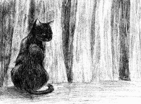 Description: Sorry for no reference pic, my scanner, like, hates me and it doesn't work. But the character I want you to draw has black hair and is a guy. He wears a white poofy shirt with a black vest with a large muffler scarf. He has black dress paints and a necklace with the teutonic charm on it. His face is young and his eyes are dark and insane-ish. Do you think you could make him sitting on a chair stoking a black cat, too?