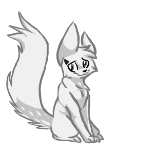 She's quite small, and has long white fur, and a long tail, w/ small paws. Her eyes are a light shade of black, and there is a black streak of fur coming out of her eye. Sitting down with a serious but sweet expression w/ a small smile.