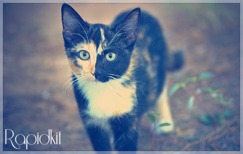 Rapidkit shows as a strippled dark calico/tortoiseshell, with a bib of striking white covering her fluffed, ductile chest and a white left hind leg. Glimmering, fervent yellow eyes highlight her daintiliy exquisite face, split into two contrasting colors of orange and deep inked black. The fiery, circular orbs that blaze with passion and dauntlessness. Rapidkit's ears are cuspidate and pointy, swiveling around her skull divering amounts of times. Her variegated pelt is composed of supple chatoyant fur, with floating sylthlike whiskers. Rapidkit's constitution is ostensibly delicate; but is genuinely quite sturdy, held up by attenuated limbs. Her physique is lithe, svelte yet endurable and capable of alacritous, salient movements. She traipses in a sort of uncoordinated way, but sprints and conflicts with sheer precision and fortitude. Though, what Rapidkit makes up for in the realm of precipitancy, she lacks in size and overall dynamism. Her cutting edge adroitness in battlling consists of short, sprightly strikes, never brute force. She has a habit of sneezing copiously; however, she will mature out of this when she inclines to an apprentice.
