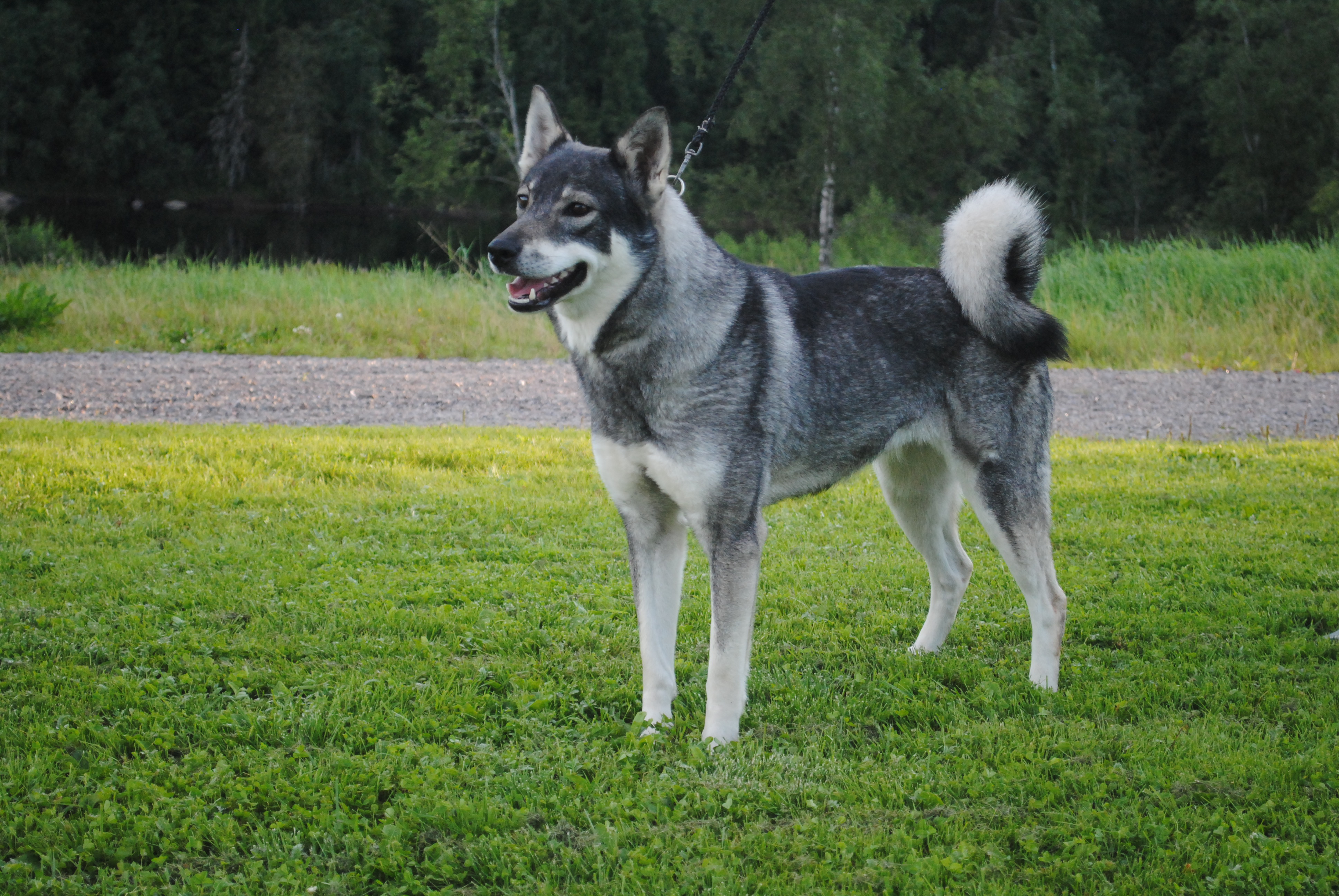 Written appearance: Iriska is mainly dark greyish-brown and white but has a brown tinged muzzle strip and fore paw tips. Her neck is a lighter shade of grey with a stripe the same colour of her neck coming down just behind her shoulders. The back of her ears are also a light brown that sprout into a small patch that turns to white. Iriska has a white chin that curls up and around her snout ending at the brown strip that starts at her nose. Her eyes are a dark yellow that fades to orange around the edges. The greyish-brown of Iriska's pelt stretches down to the outside of her legs that quickly fade into a bright white. Her tail is curled around to the left flank with the top being a dark grey with a black tip and the bottom being completely white. Her pelt is the common colour of the Jämthund(I can't explain EVERYTHING XD).